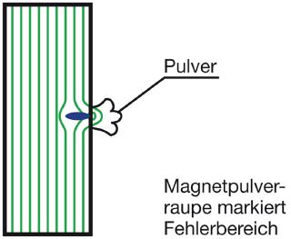 Die Magnetpulverprüfung ist ein empfindliches Verfahren zum Nachweis von Unregelmäßigkeiten in der Oberfläche ferromagnetischer Werkstoffe mit einer relativen Permeabilität µr >100, z.B. Stahl, Gusseisen, Kobalt, Nickel. Auch oberflächennahe Unregelmäßigkeiten können nachgewiesen werden. Die Tiefe nachweisbarer Fehler hängt davon ab, ob ein Wechselfeld oder ein Gleichfeld eingesetzt wird: