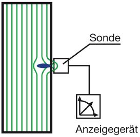 Bei der Magnetisierung des ferromagnetischen Werkstoffes entstehen über Materialtrennungen (z.B. Risse, Poren) Streuflüsse. Der Nachweis kann wie folgt durchgeführt werden: